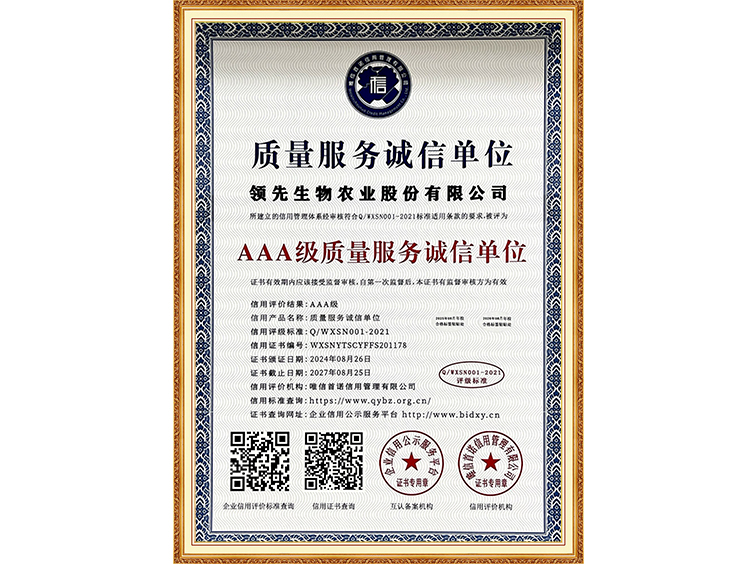 AAA級(jí)質(zhì)量服務(wù)誠(chéng)信單位